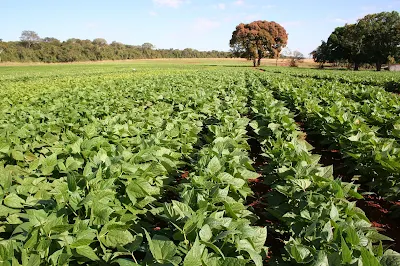 Logo acima, grande plantação de soja na Região Centro-Oeste do Brasil. Este país sul americano é o maior produtor e exportador mundial de soja do mundo, posição ocupada até recentemente pelos Estados Unidos. Logo abaixo, moderna plantação de arroz por irrigação no Brasil, uma opção de produção que não depende de áreas alagadas.
